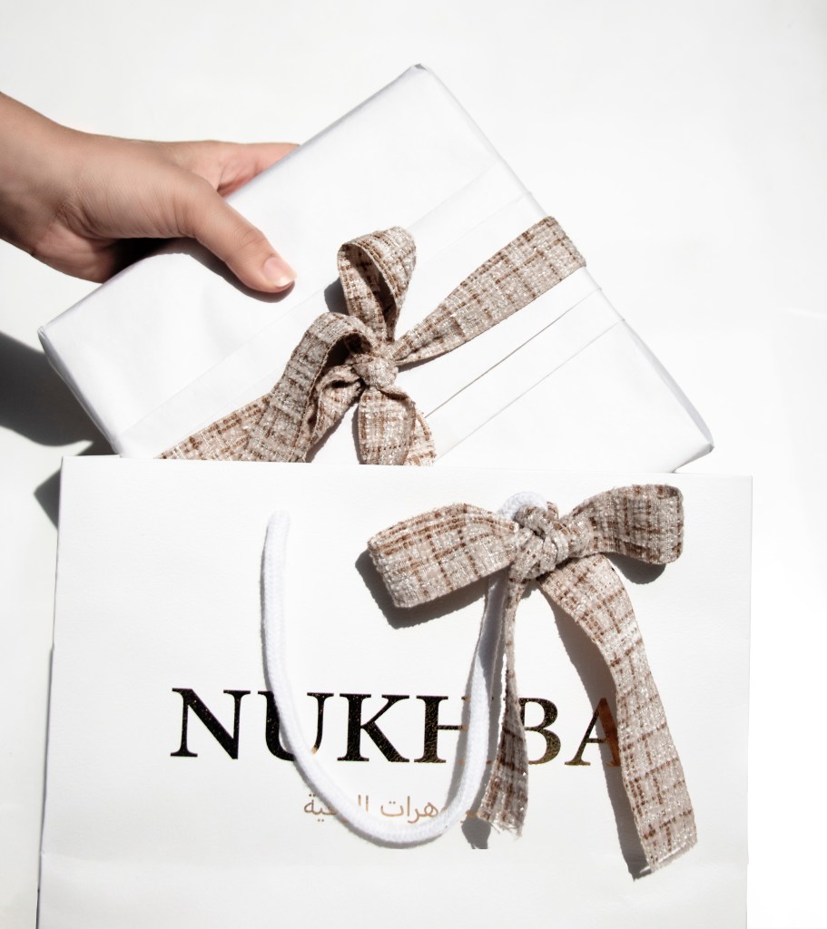 Each order is carefully wrapped in a white Nukhba packaging with a textured beige and golden ribbon. Distinct and endlessly sophisticated, the packaging is finished with the same attention to detail as its jewellery masterpieces